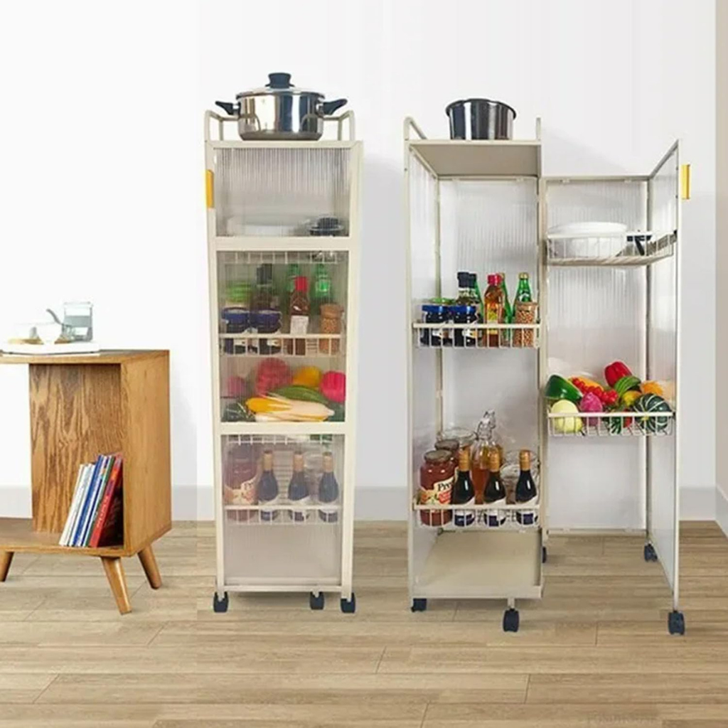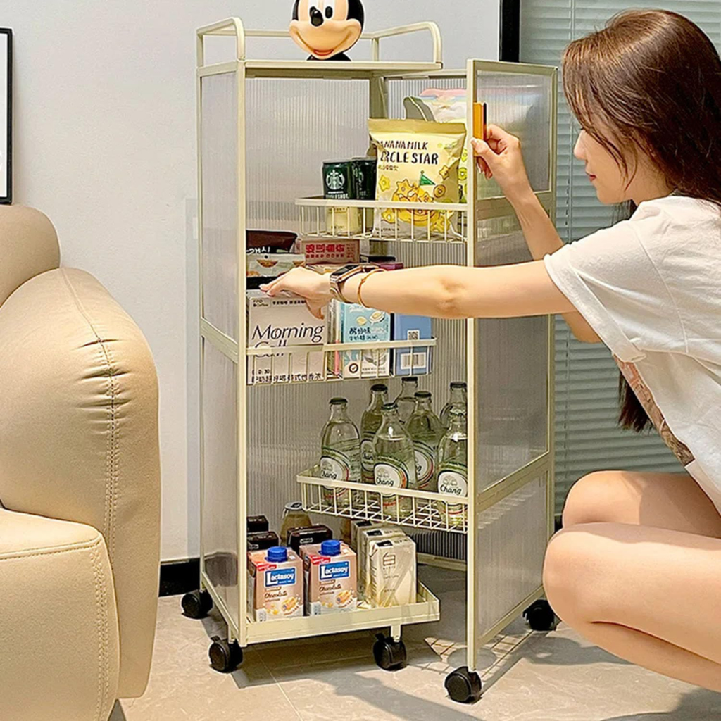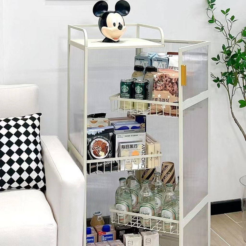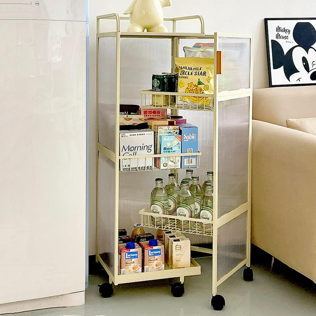 El frente estriado translúcido mantiene la privacidad visual sin perder elegancia. El marco metálico en tono crema se integra perfecto con estilos nórdicos o minimalistas. El asa superior facilita el manejo diario: lo llevás de la cocina al baño en un segundo.