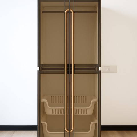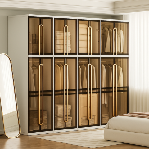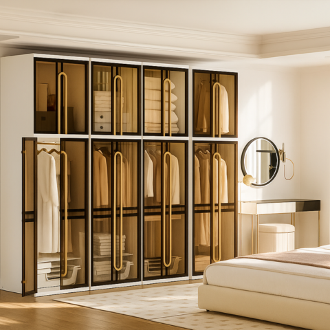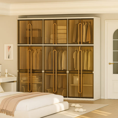 Cada línea, cada textura y cada unión del armario fueron pensadas para reflejar calidad y buen gusto. Las puertas translúcidas dejan entrever su interior con sutileza, manteniendo un aspecto prolijo y sofisticado. Es el tipo de mueble que no solo organiza, sino que también embellece el ambiente, haciendo que tu casa se sienta más serena y acogedora.