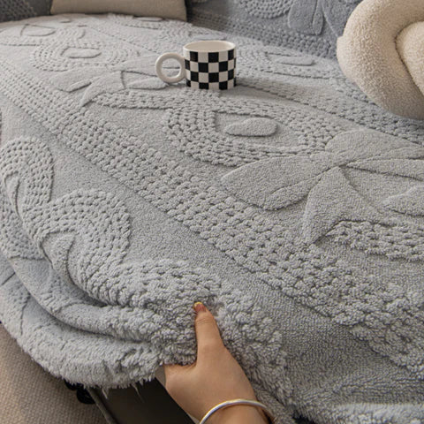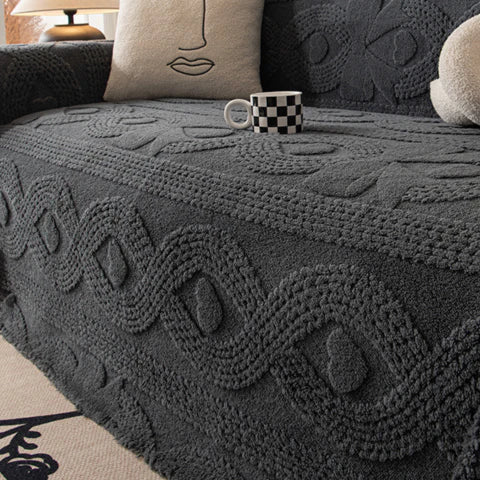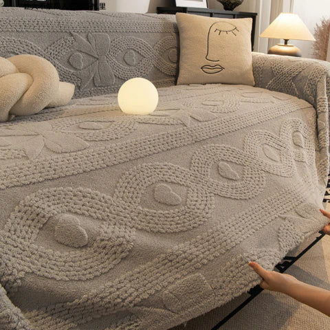 El tejido en relieve con formas entrelazadas y flores bordadas resalta el trabajo manual y la dedicación artesanal de cada pieza. Los tonos neutros se adaptan a cualquier estilo de decoración, creando un ambiente cálido y armonioso.