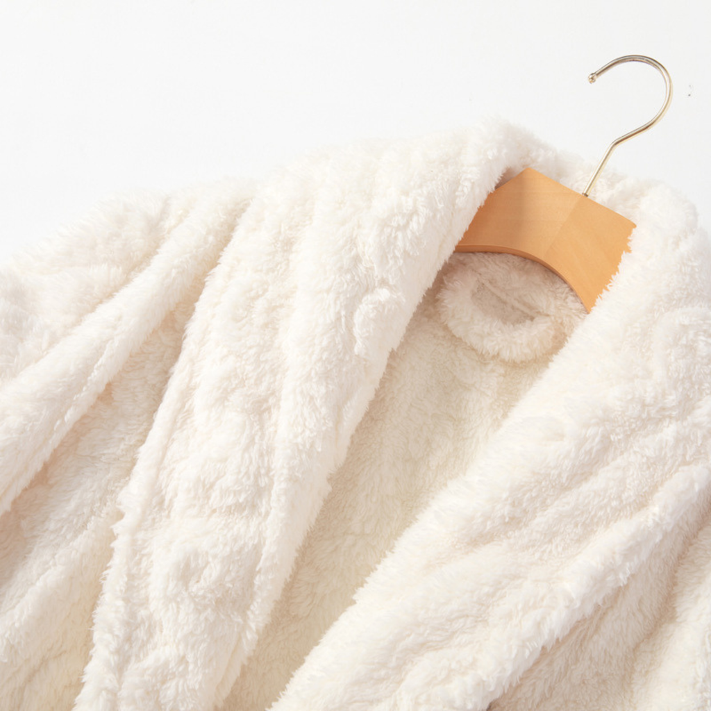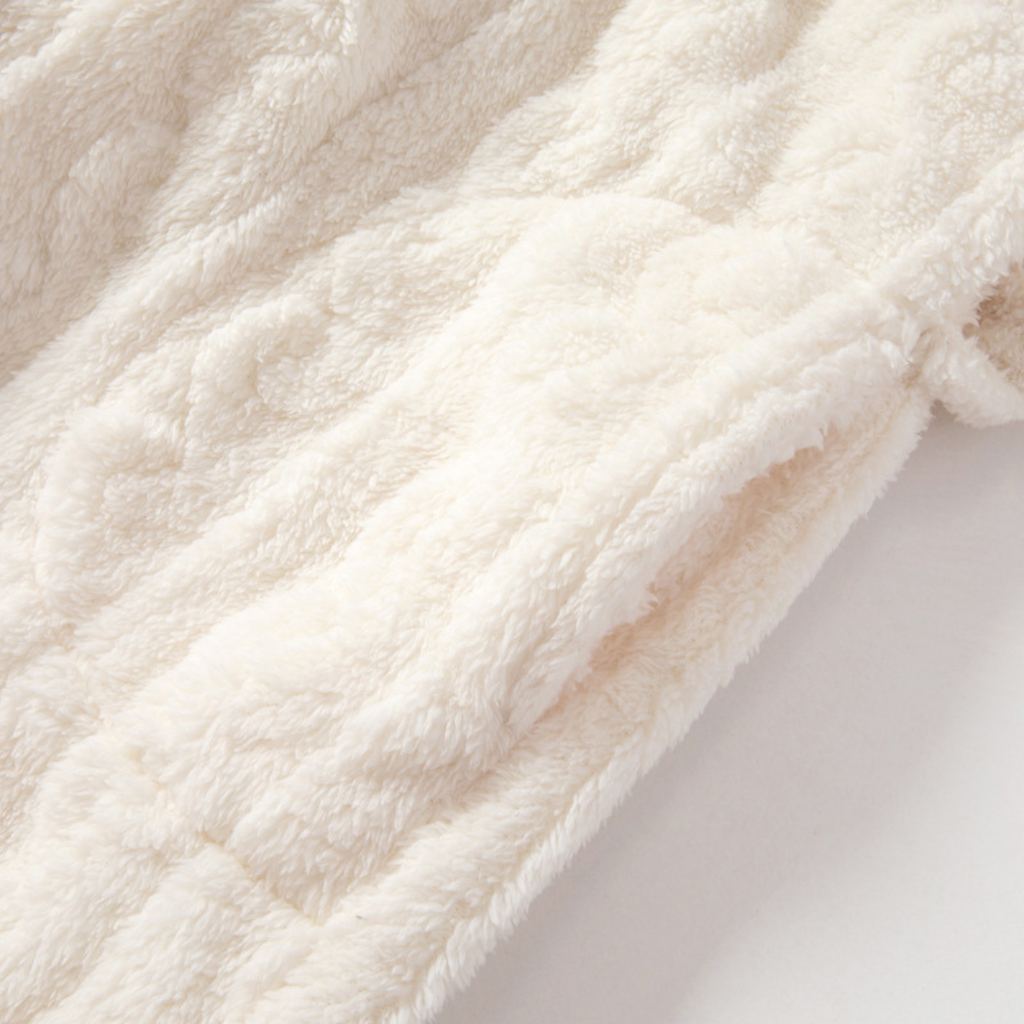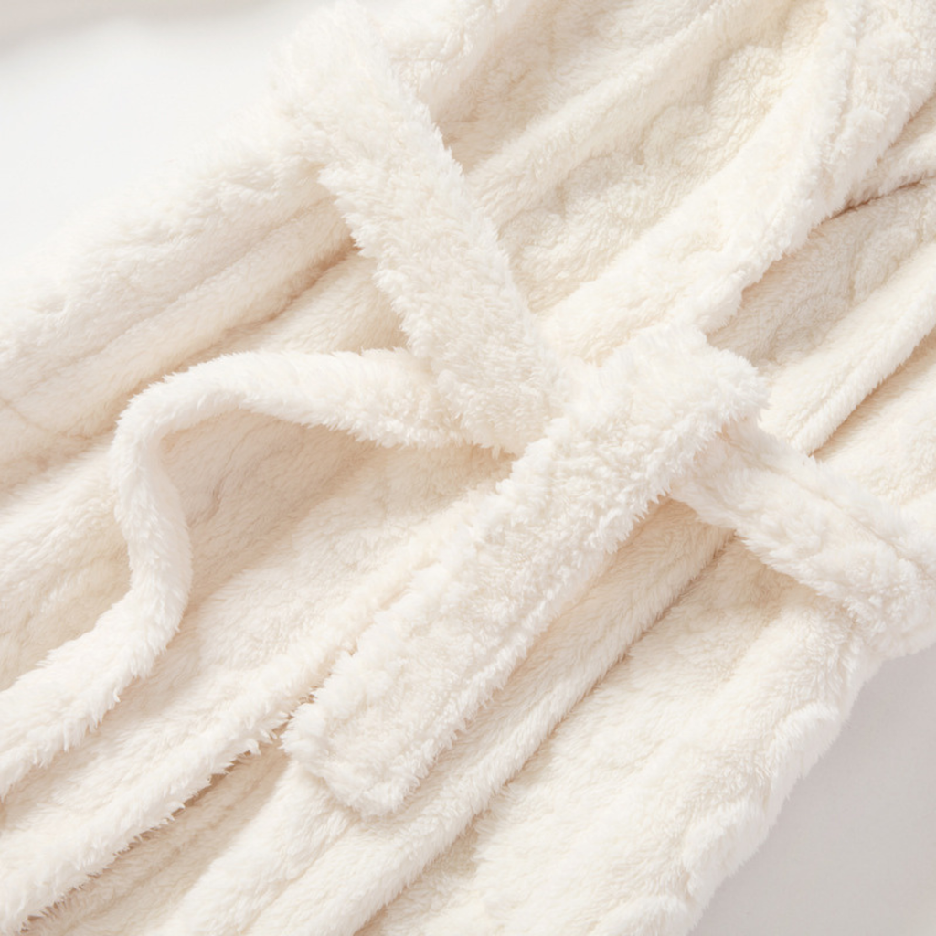 El diseño de este roupão combina comodidad absoluta con un toque sofisticado. Su textura con relieves trenzados crea un efecto visual encantador, y los bolsillos delanteros aportan practicidad sin perder elegancia. Ideal para usar sobre la pijama o como prenda de relax en casa, sin resignar estilo ni feminidad.
